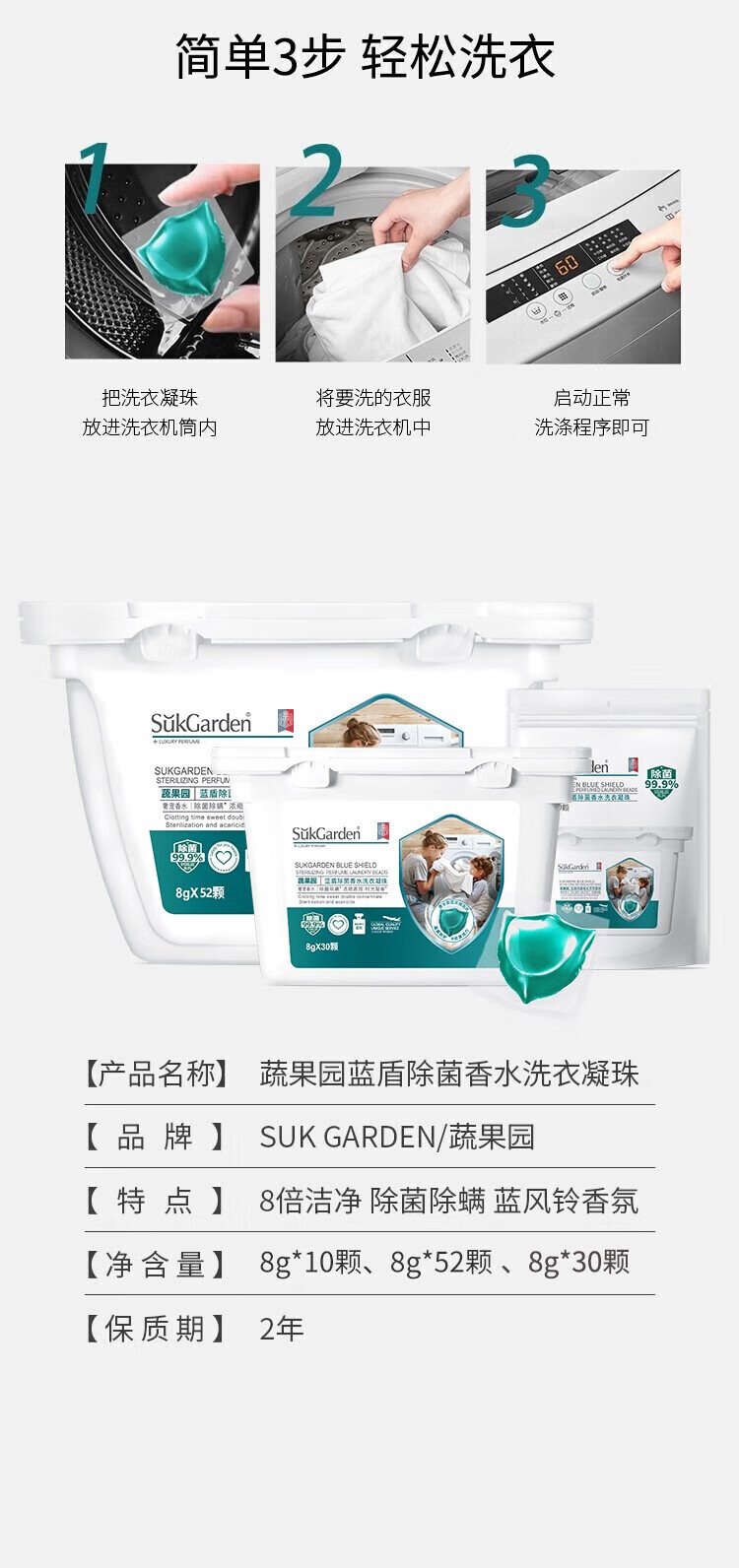 商品名称:蔬果园(SukGarden)蓝盾除菌香水洗衣凝珠-8g*52颗 SGY0243