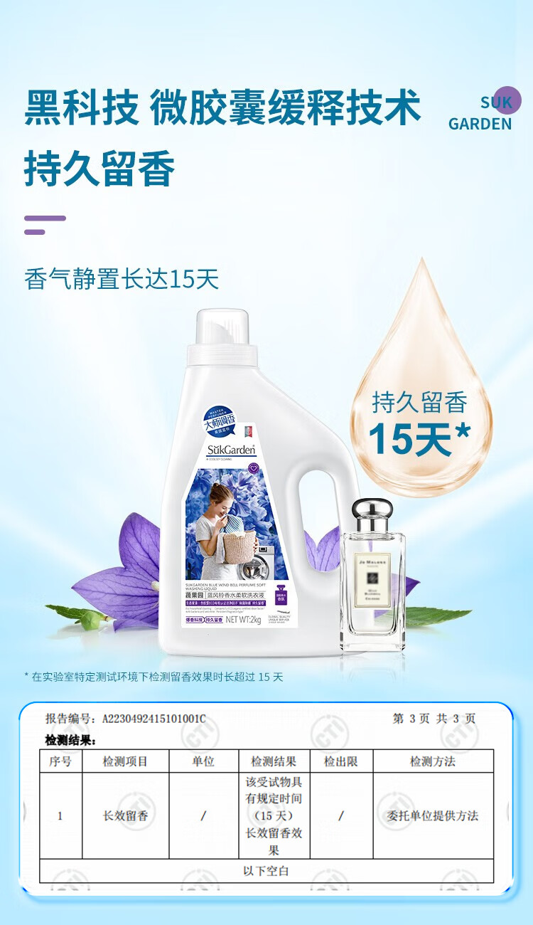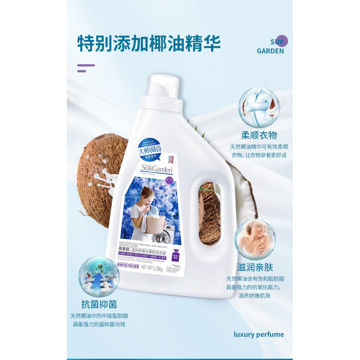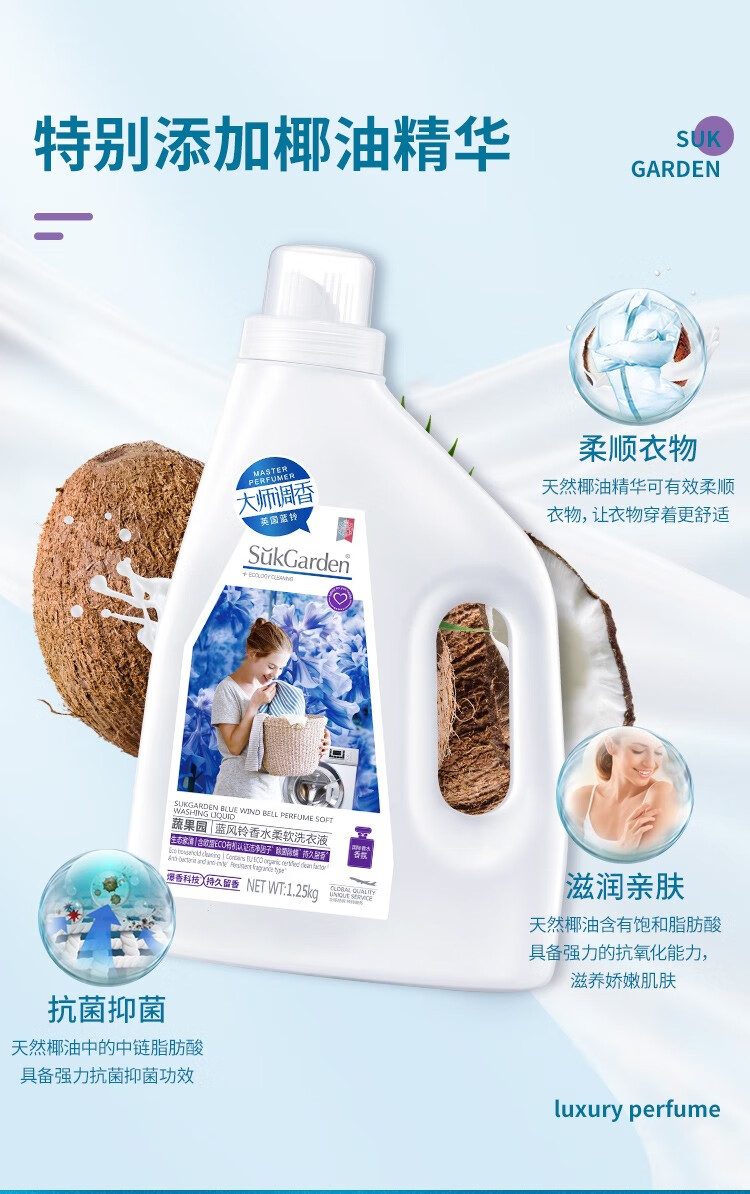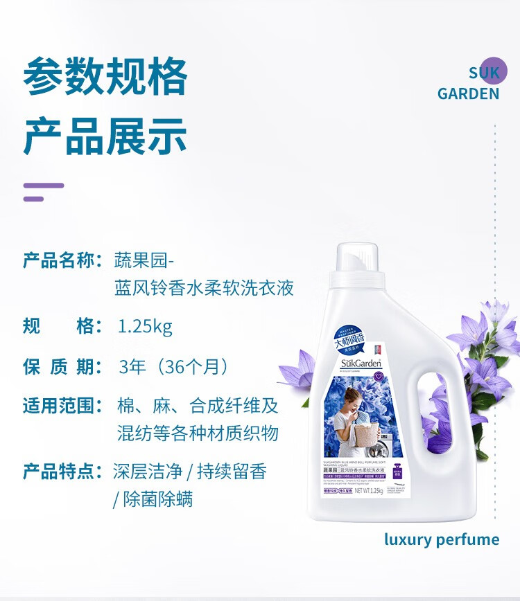商品名称:蔬果园(SukGarden)蓝风铃香水柔软洗衣液(谷爱凌线上版)-1.25kg SGY0512