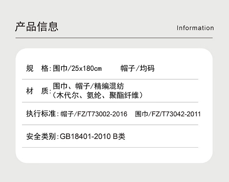 规格尺寸 :围巾/25x180cm 帽子/均码
