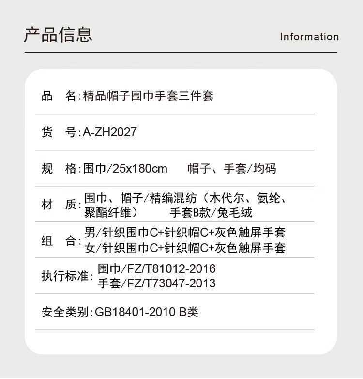 规格尺寸 :围巾/25x180cm 帽子、手套/均码