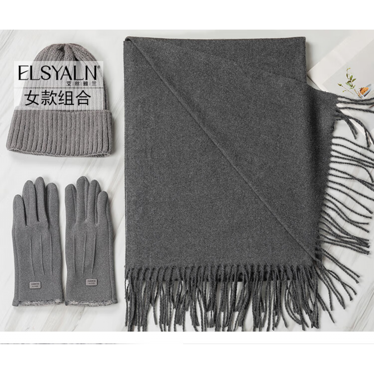 灰色围巾+针织帽B+灰色触屏手套