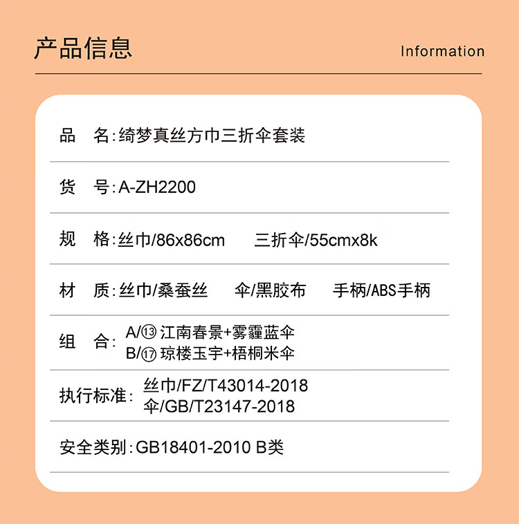 规格尺寸 :丝巾/86x86cm/三折伞/55cmx8K