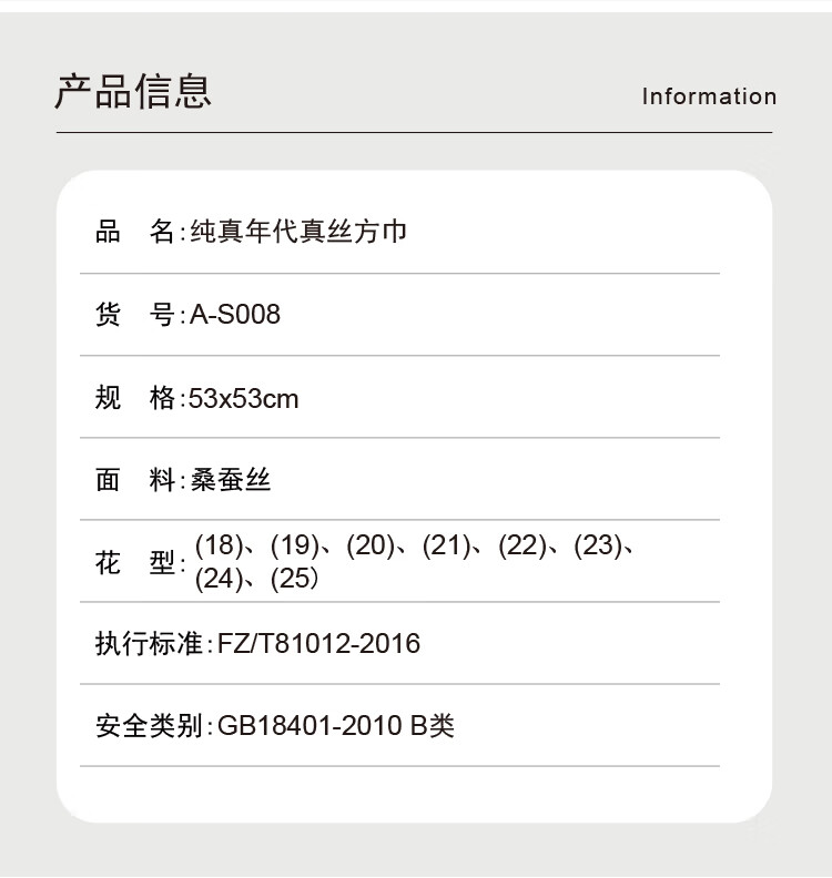 商品名称:艾丝雅兰 纯真年代真丝小方巾 A-S008 53x53cm