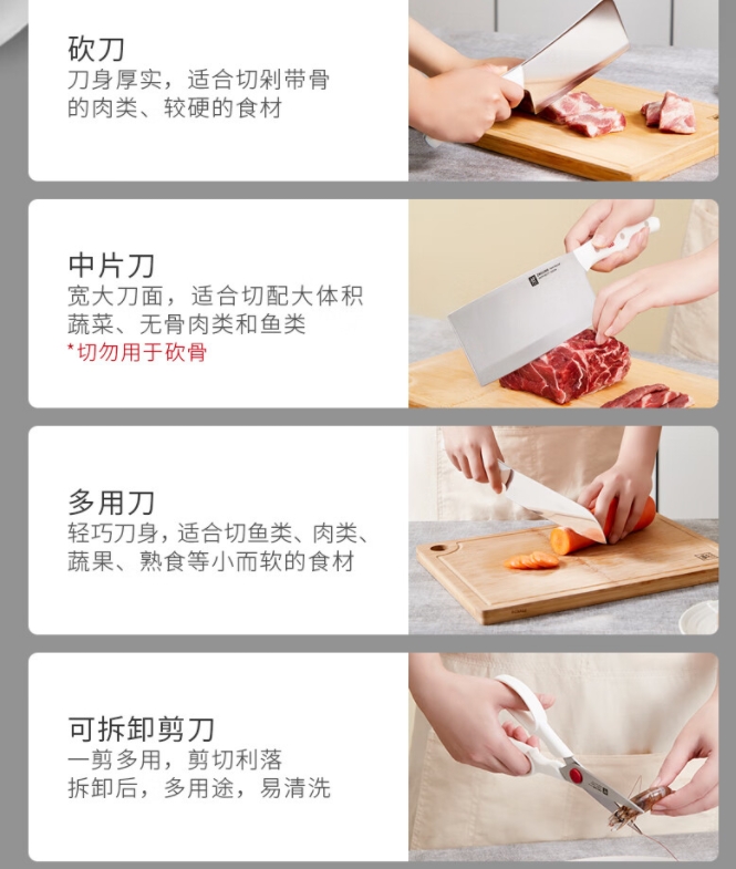 配置清单 :多用刀*1 小巧多用刀*1可拆卸剪刀*1中片刀*1砍刀*1除菌刀架*1