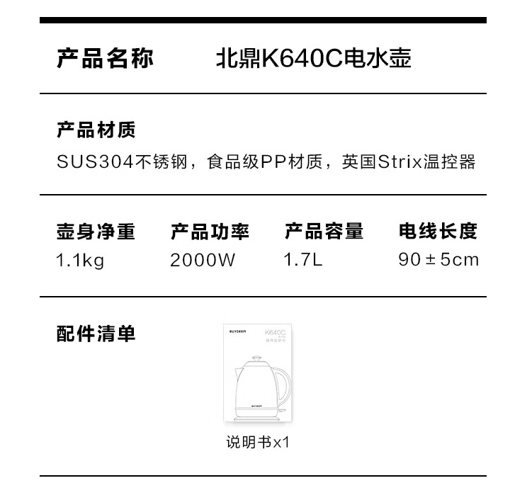 商品名称:北鼎(Buydeem)304不锈钢家用电水壶 1.7L K640C