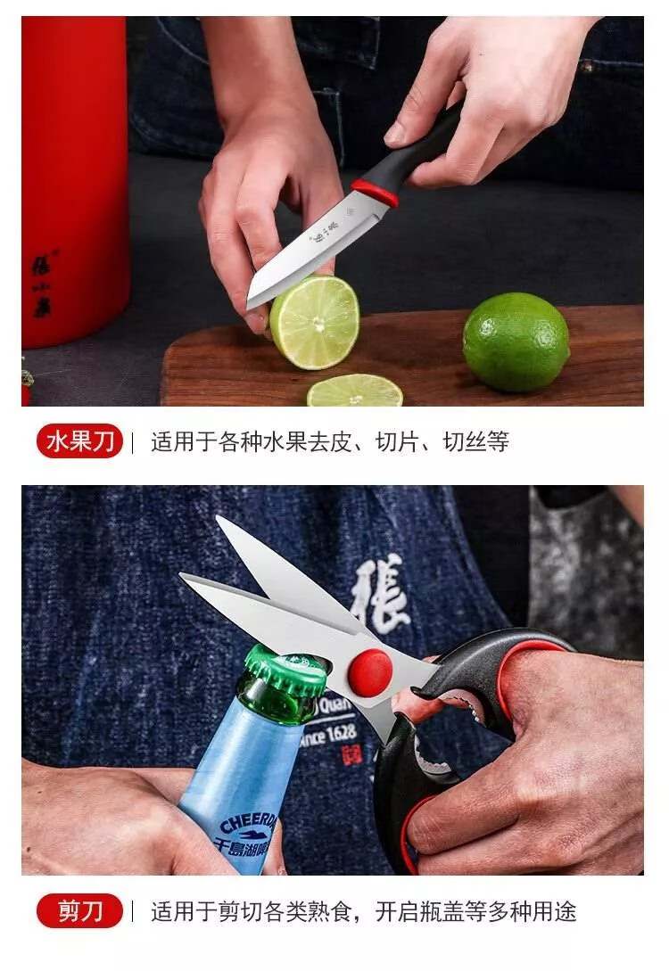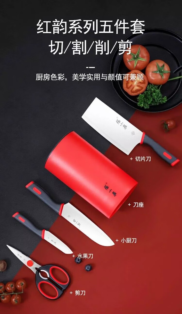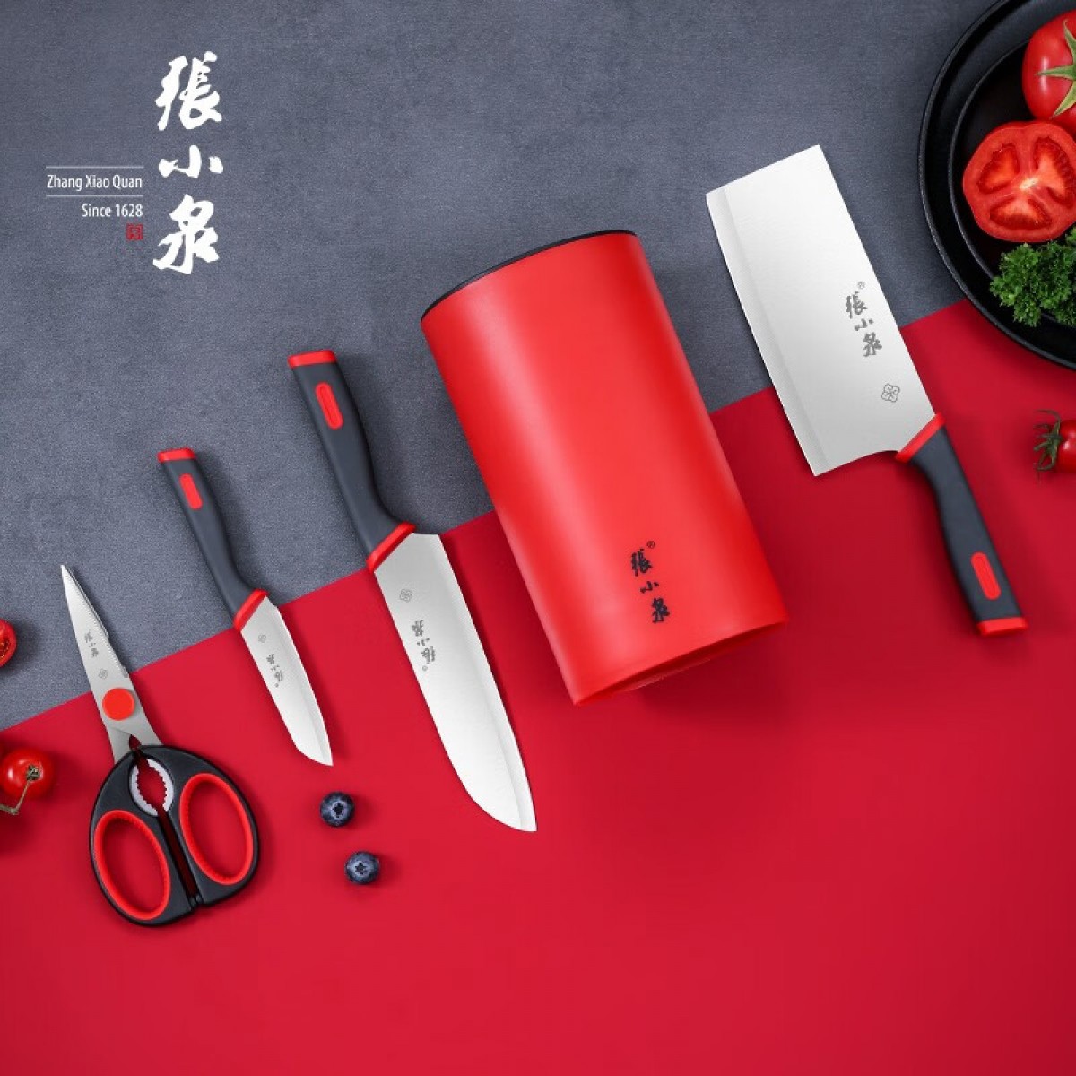 张小泉 红韵系列刀具五件套切片刀180mm/小厨刀175mm/水果刀90mm/厨房剪212mm/刀座