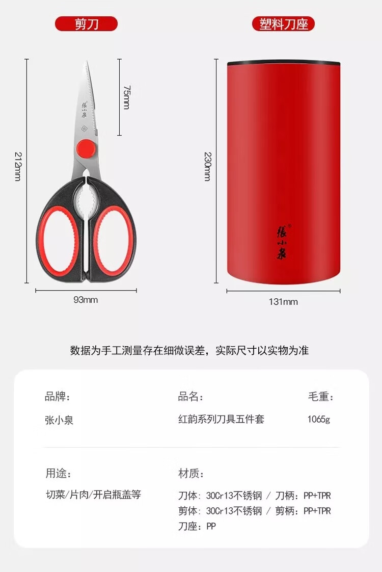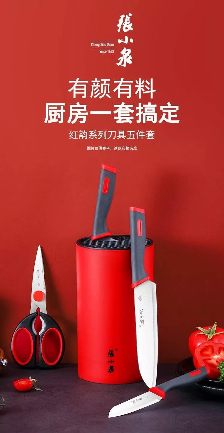 商品名称:张小泉 红韵系列刀具五件套切片刀180mm/小厨刀175mm/水果刀90mm/厨房剪212mm/刀座