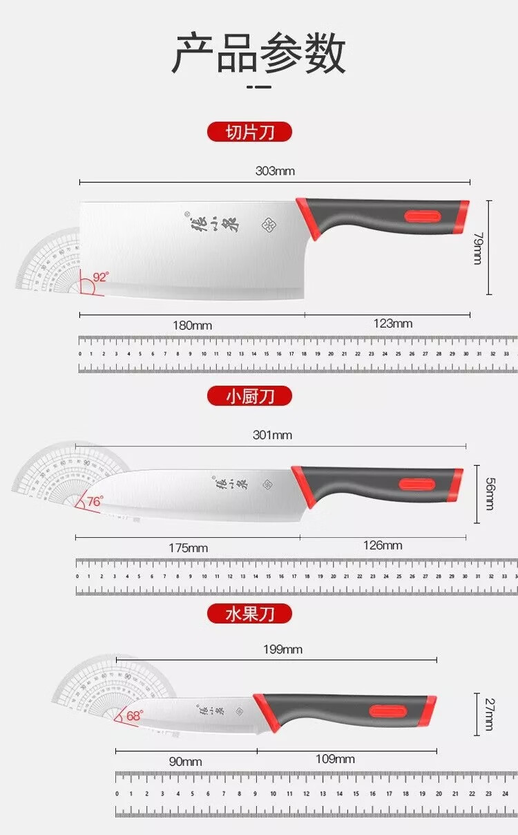 产品尺寸 :切片刀303*79mm,小厨刀301*56mm,水果刀199*27mm,厨房剪212*93mm,刀座230*131mm