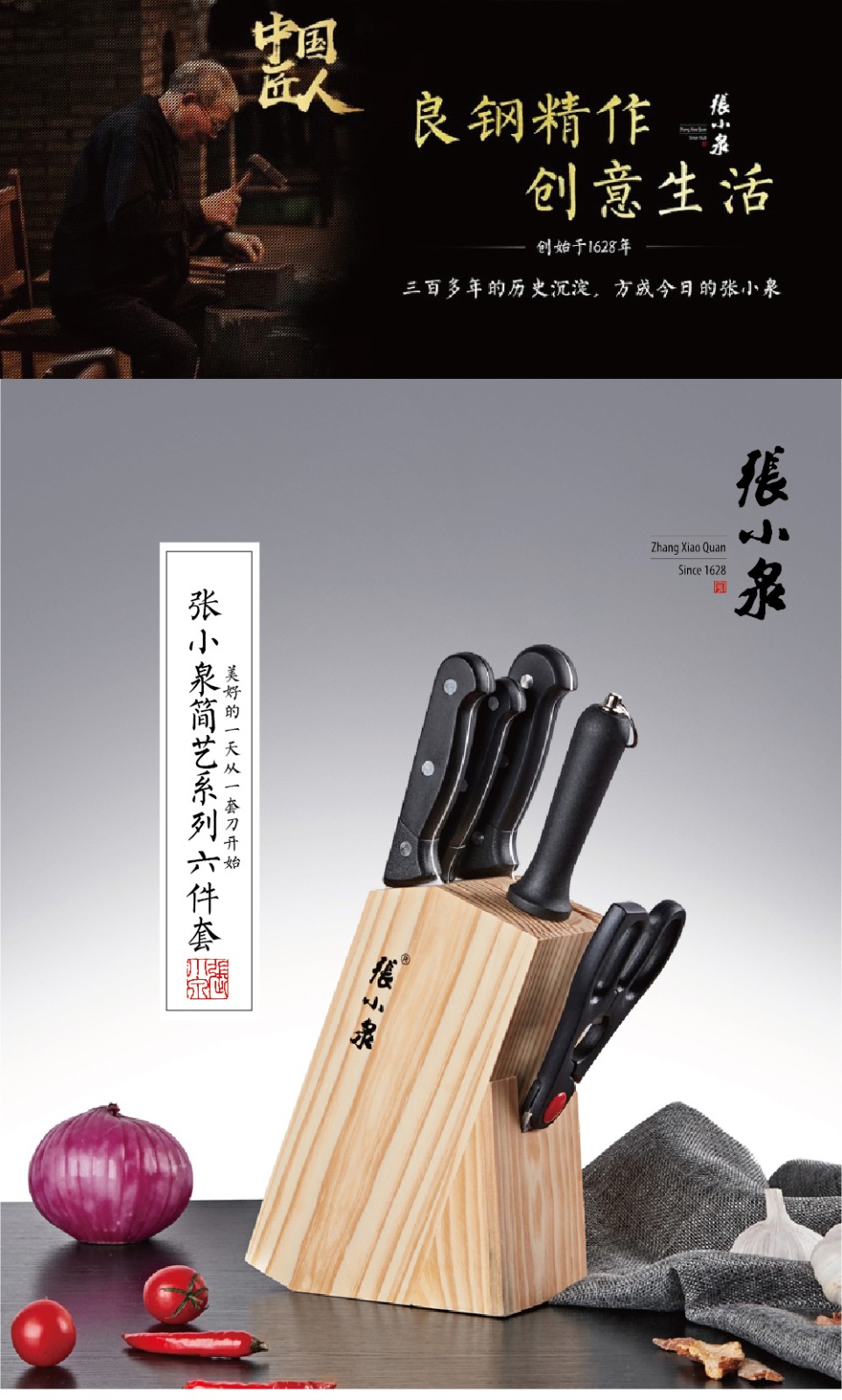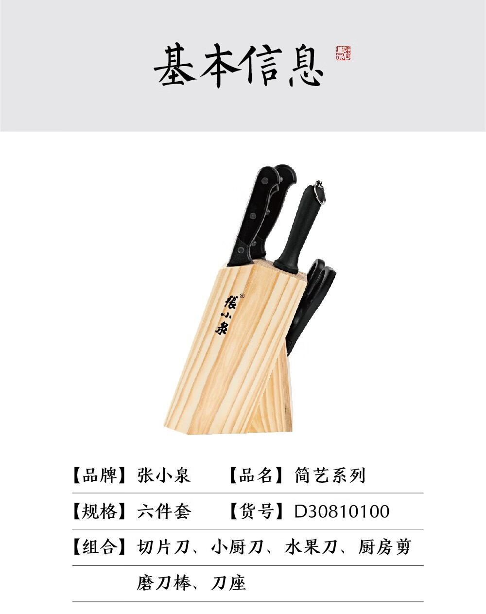 商品名称:张小泉 简艺系列套装刀具六件套 D30810100 切片刀188mm/小厨刀189mm/水果刀105mm/厨房剪205mm/刀座