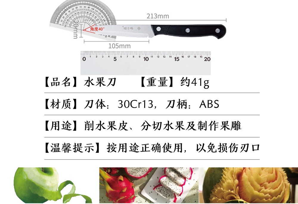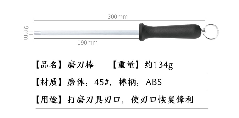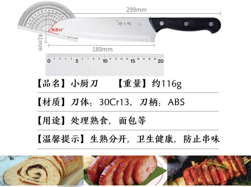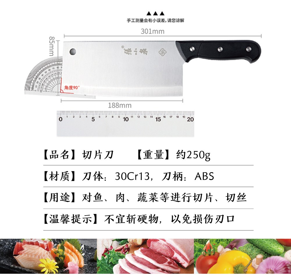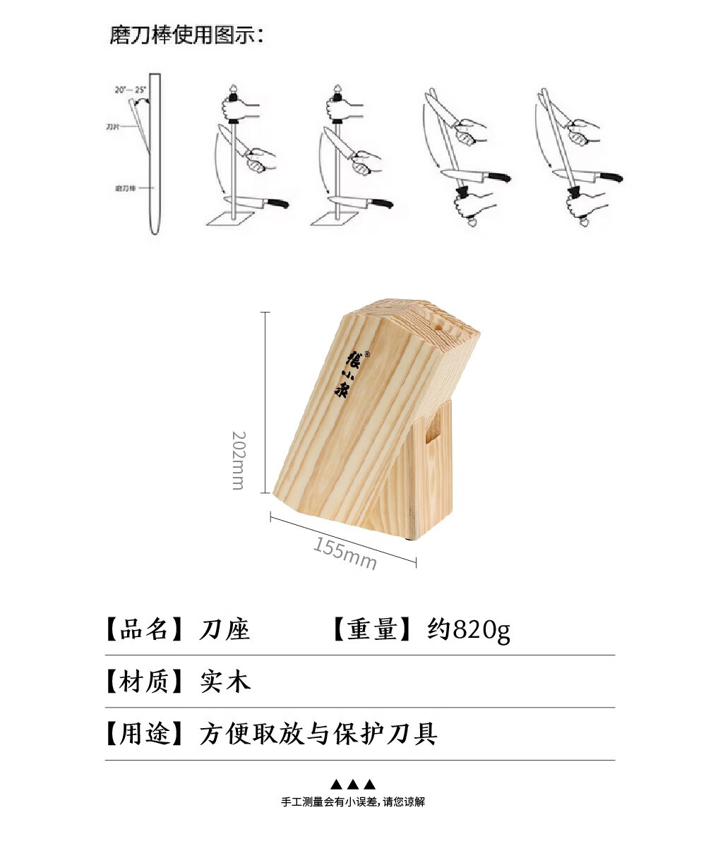 产品尺寸 :切片刀301*85mm,小厨刀299*41mm,水果刀213*20mm,厨房剪202*81mm,磨刀棒300*9mm,刀座202*155mm