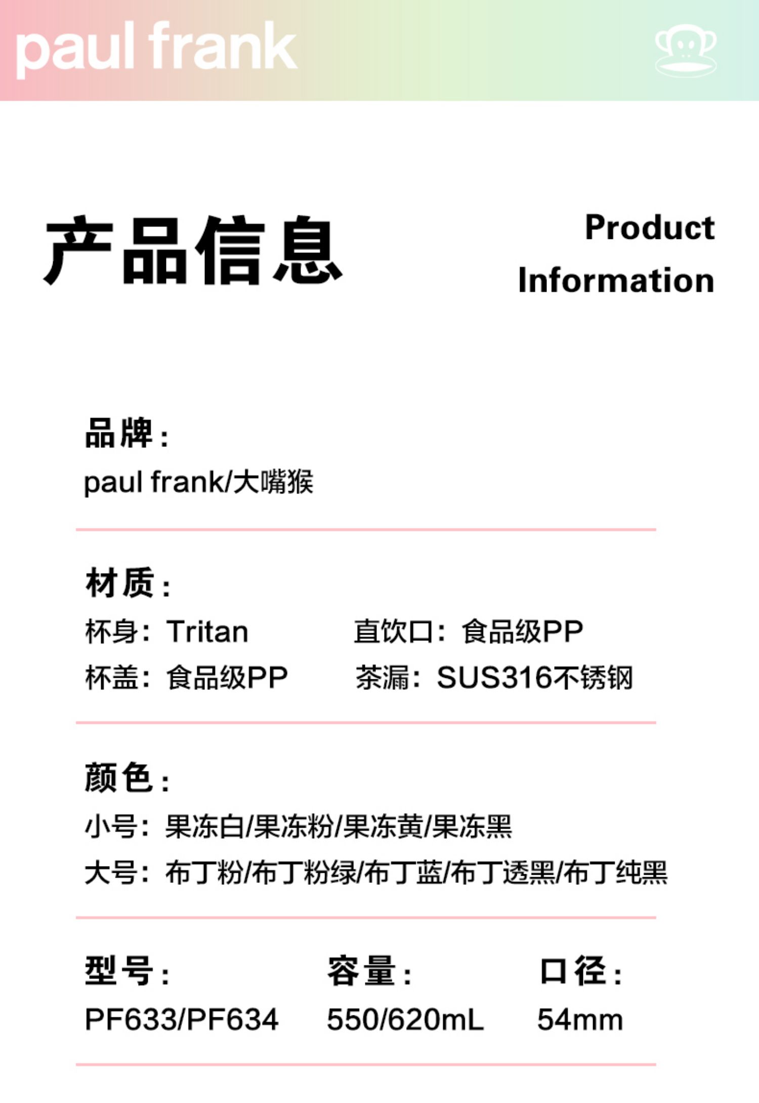 商品名称:大嘴猴 Paul Frank 便携随手杯 550ml PF633-550