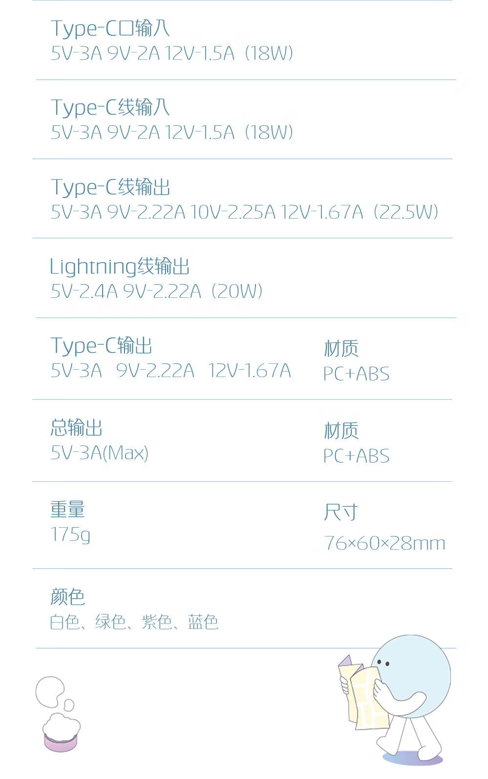 Type-C口输出:5V-3A 9V-2.22A 12V-1.67A(20W) Type-c线输出: 5V-3A 9V-2.22A 10V-2.25A 12V-1.67A(22.5W) lightning线输出:5V-2.4A 9V-2.22A(20W) 多口同时总输出:5V-3A(Max)