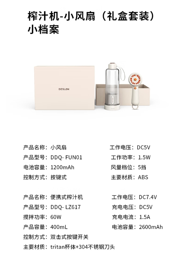 商品名称:德世朗(DESLON) 榨汁机-小风扇(套装) 400mL DDQ-TZ01