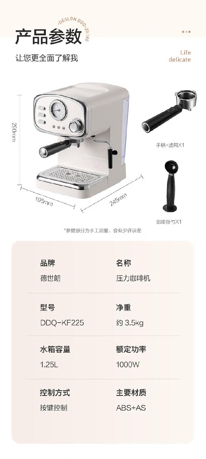 商品名称:德世朗(DESLON) 压力咖啡机(意式半自动) 1.25L DDQ-KF225