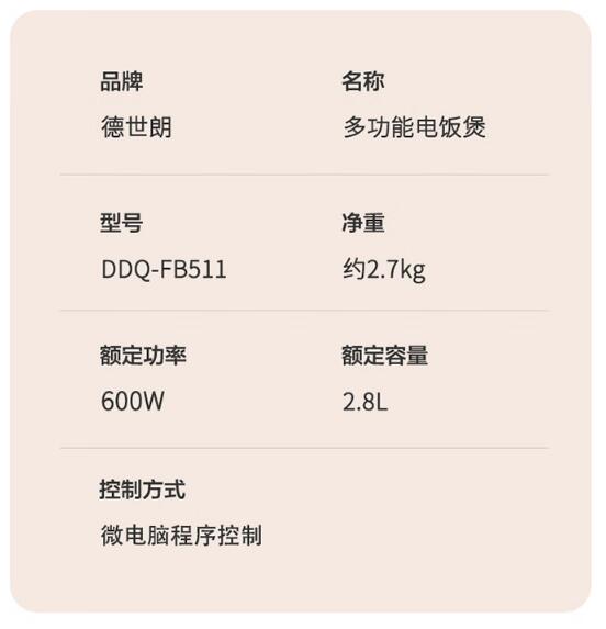 商品名称:德世朗(DESLON) 多功能电饭煲 2.8L DDQ-FB511