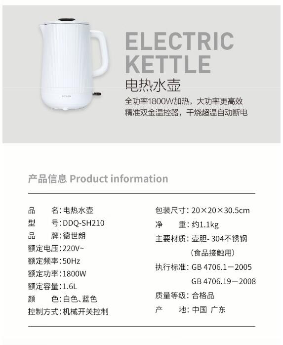 商品名称:德世朗(DESLON) 电热水壶 1.6L DDQ-SH210