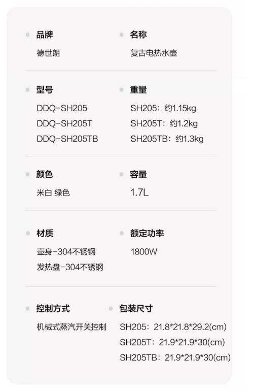 商品名称:德世朗(DESLON) 电热水壶 1.7L 绿色 DDQ-SH205-GN
