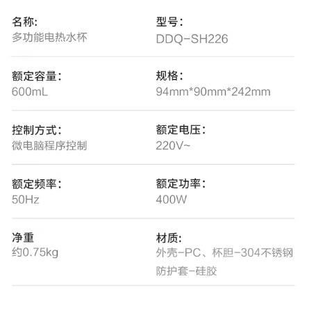 商品名称:德世朗(DESLON) 多功能电热水杯 600mL DDQ-SH226