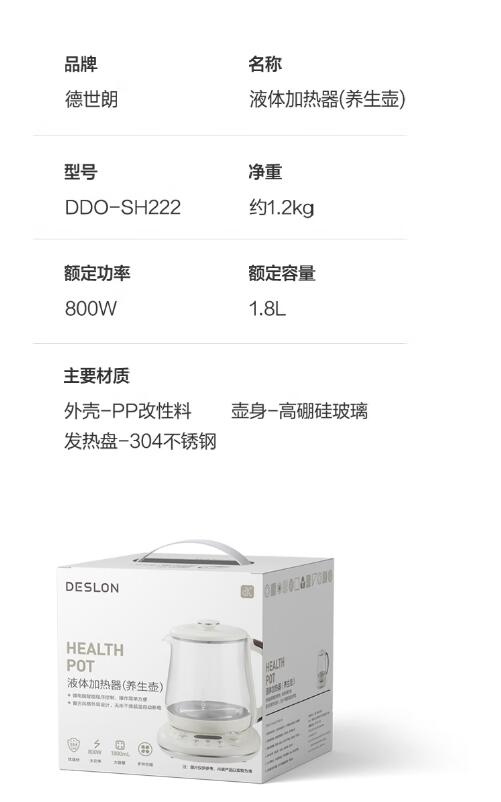 商品名称:德世朗(DESLON)液体加热器(养生壶) 1.8L DDQ-SH222