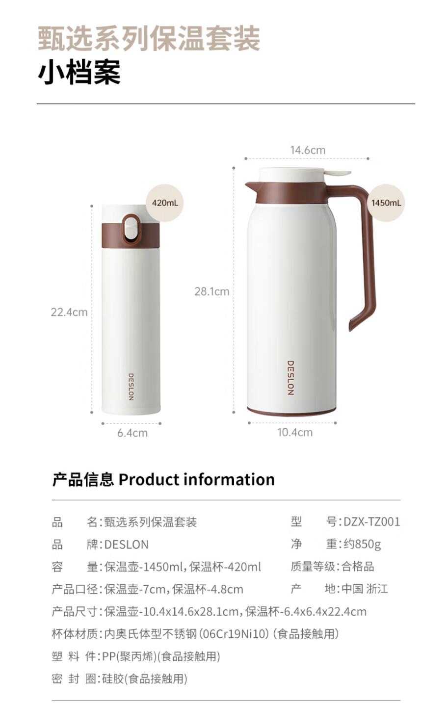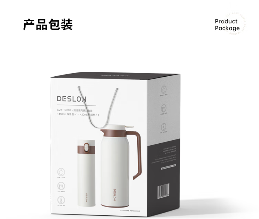 商品名称:德世朗(DESLON) 甄选系列保温套装 保温壶-1450mL 保温杯-420mL DZX-TZ001