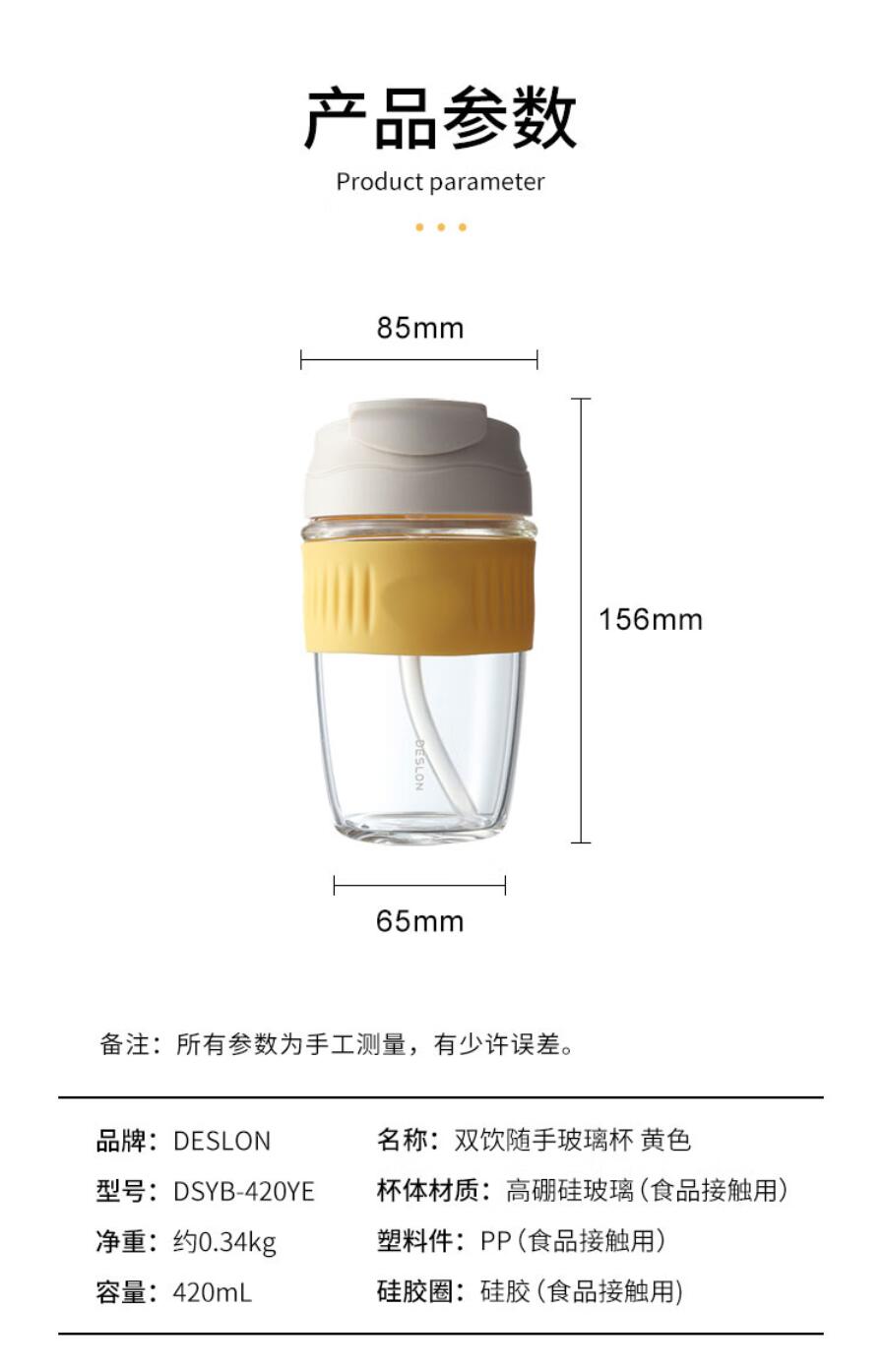 商品名称:德世朗(DESLON) 双饮随手玻璃杯 420mL DSYB-420YE