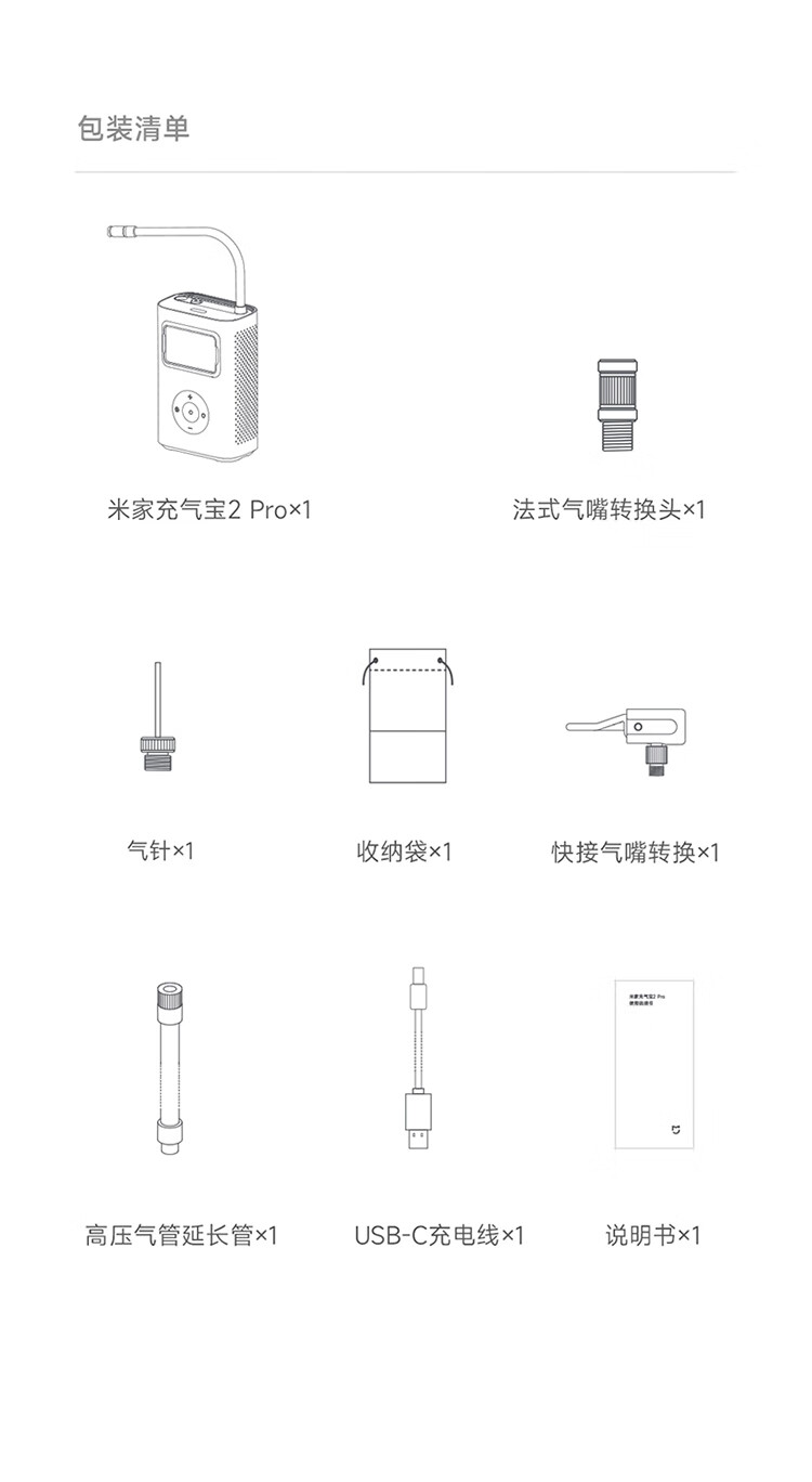 包装清单 :米家充气宝2Pro, 气针,法嘴,快接气嘴,束口袋,说明书,高压气管延长管,USB-c®️充电线,三包凭证
