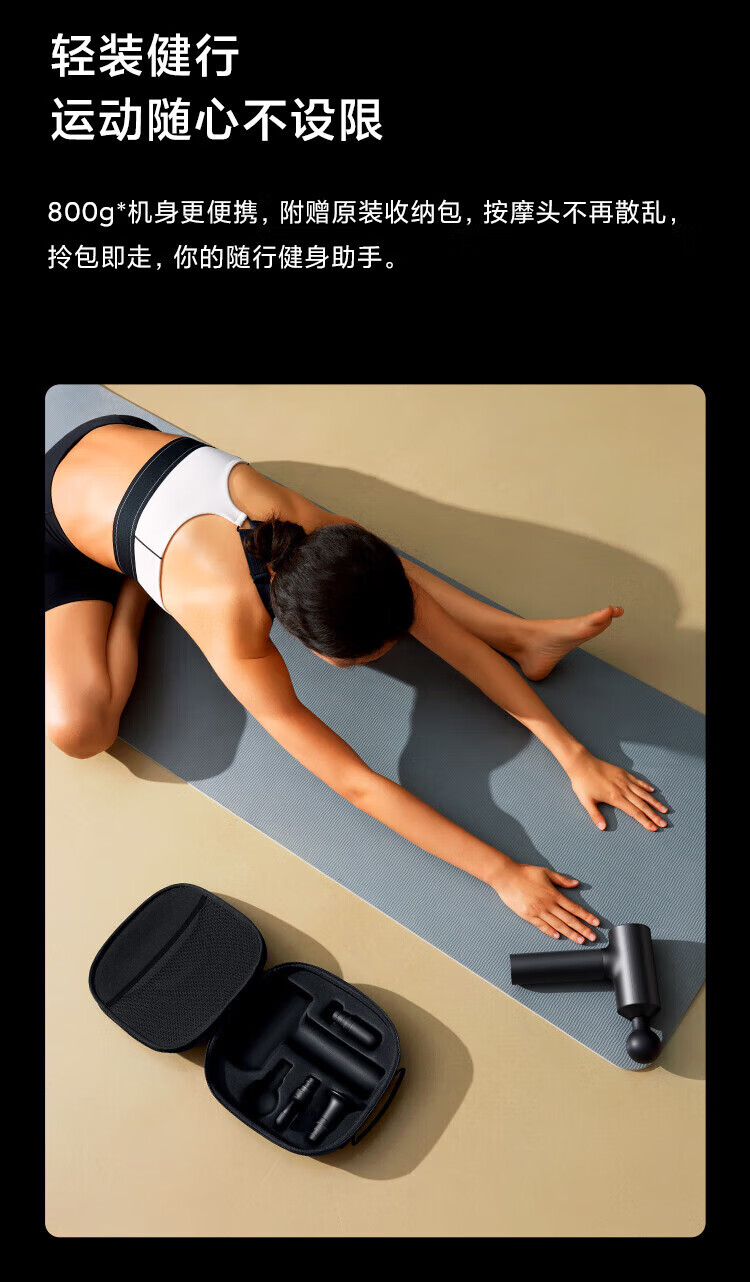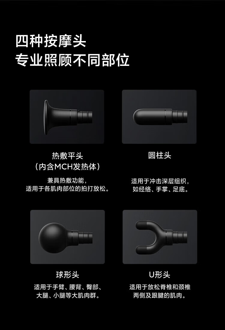 包装清单 :筋膜枪、热敷平头、圆柱头、球型头、U型头、充电线、说明书、收纳包