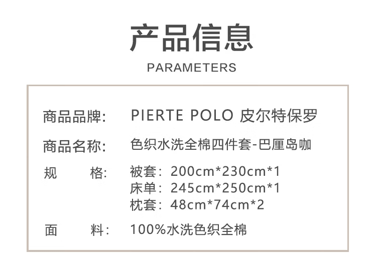 商品名称:PIERTE POLO 皮尔特保罗 色织水洗全棉四件套-巴厘岛咖 200cm*230cm PPLS-2461