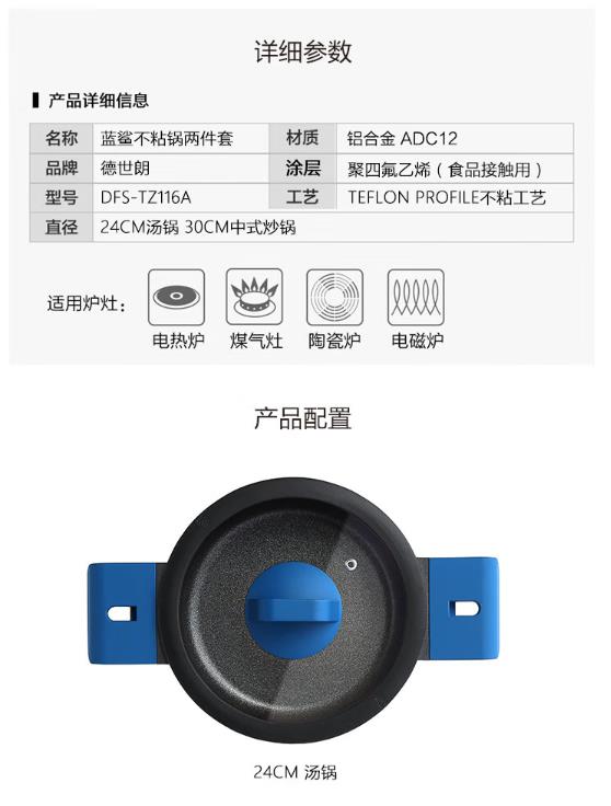 商品名称:德世朗(DESLON) 蓝鲨不粘锅两件套 DFS-TZ116A