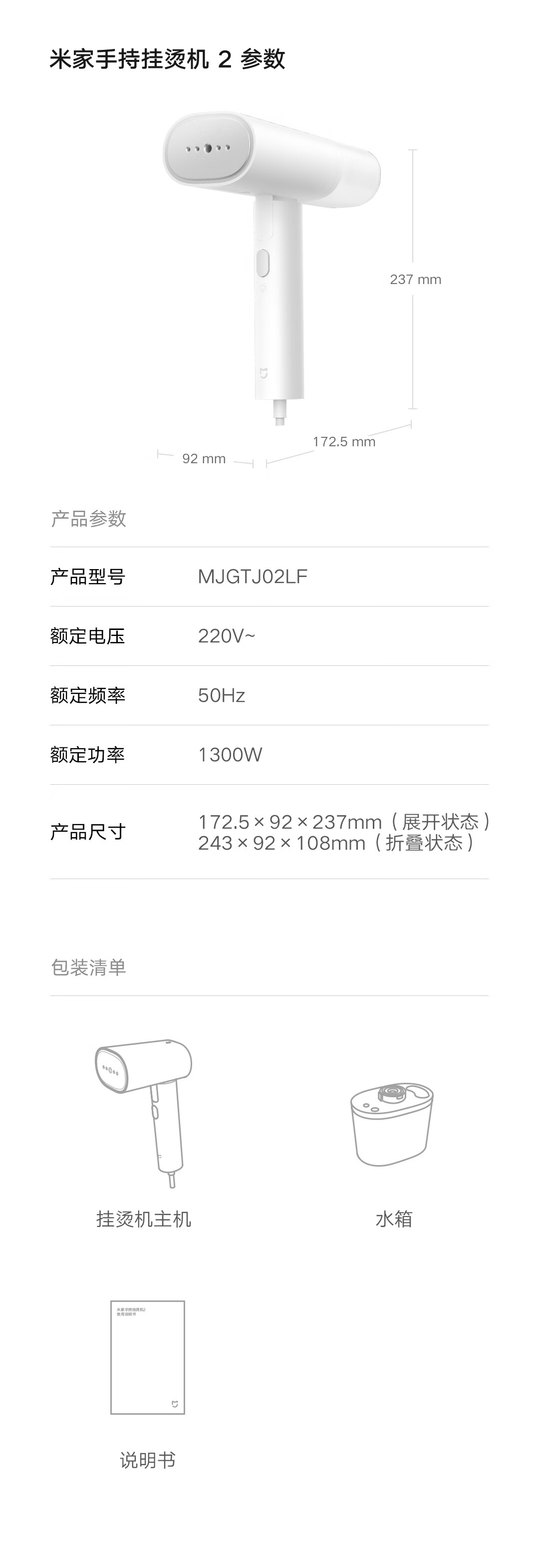 商品名称:小米 手持挂烫机2 折叠挂烫机 160ml水箱