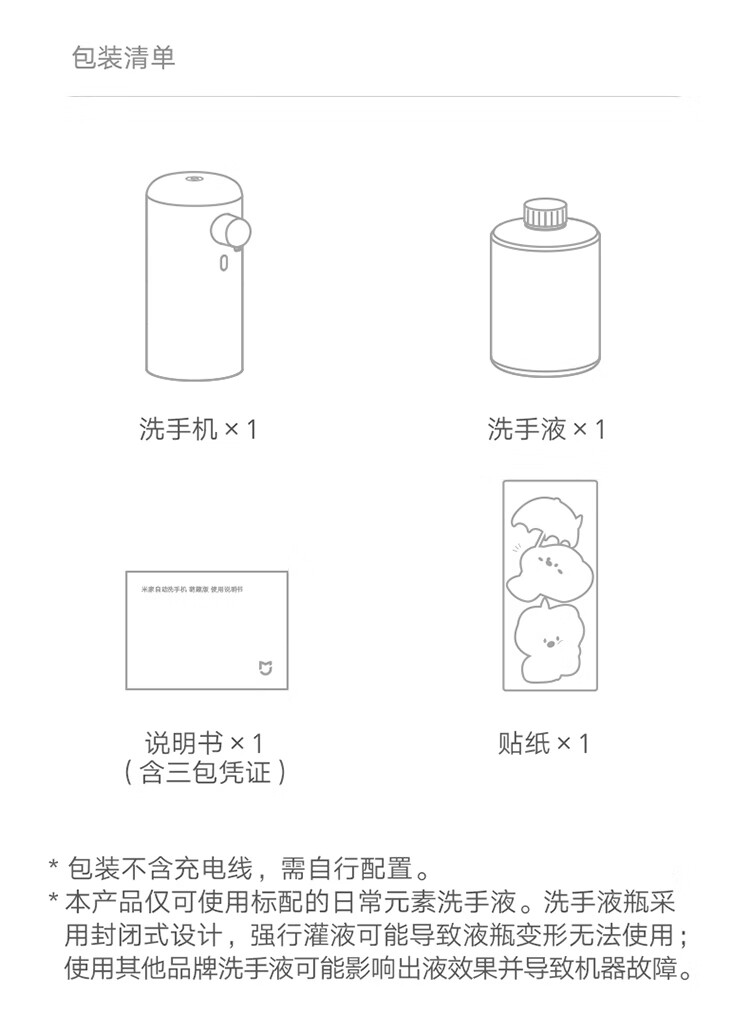 包装清单 :洗手机、洗手液、说明书(含三包凭证)、贴纸