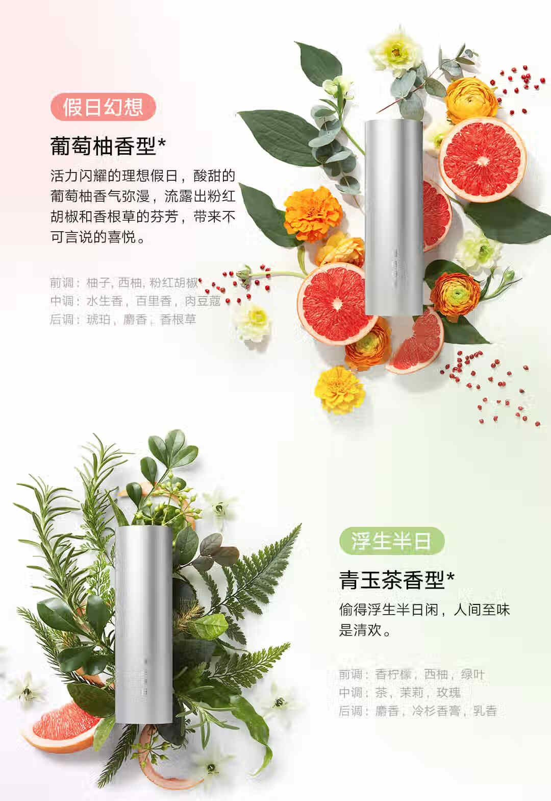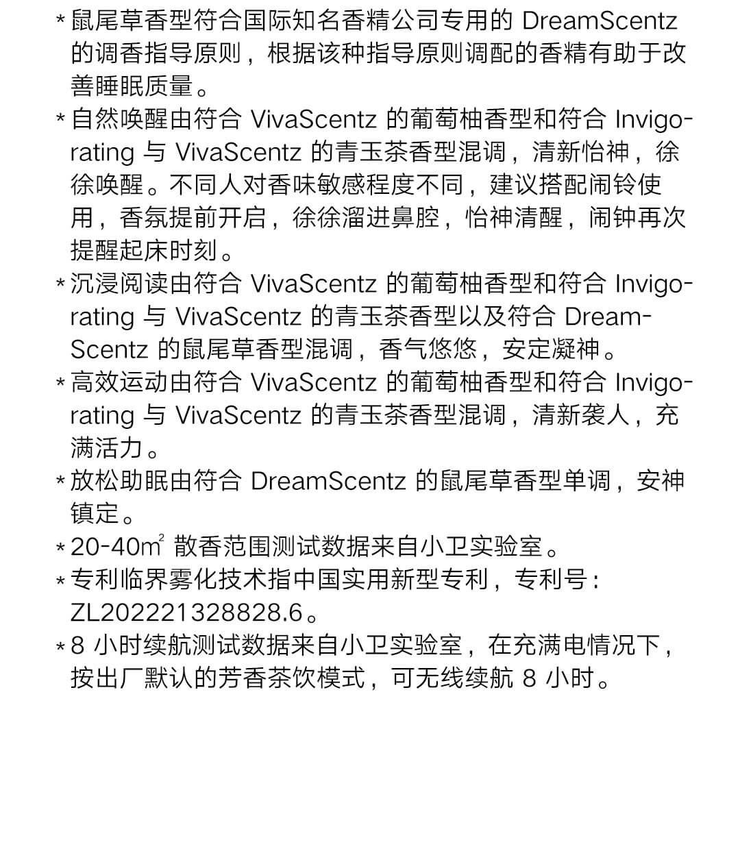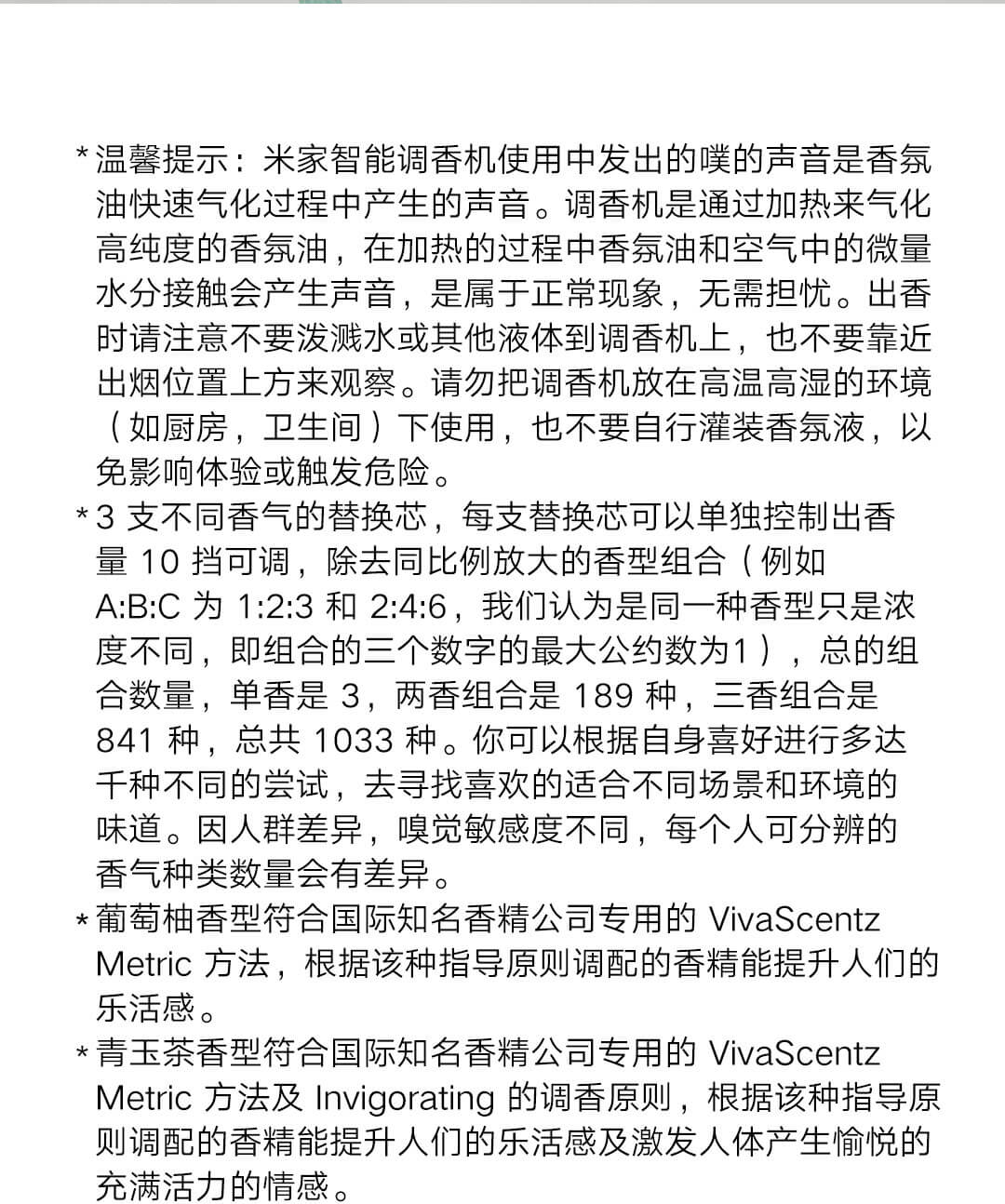 包装清单 :调香机*1、调香机替换芯*3、充电底座*1、充电线*1、适配器*1、说明书(含三包凭证)*1