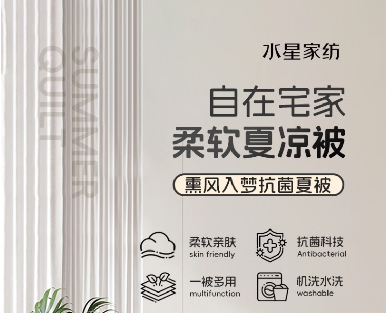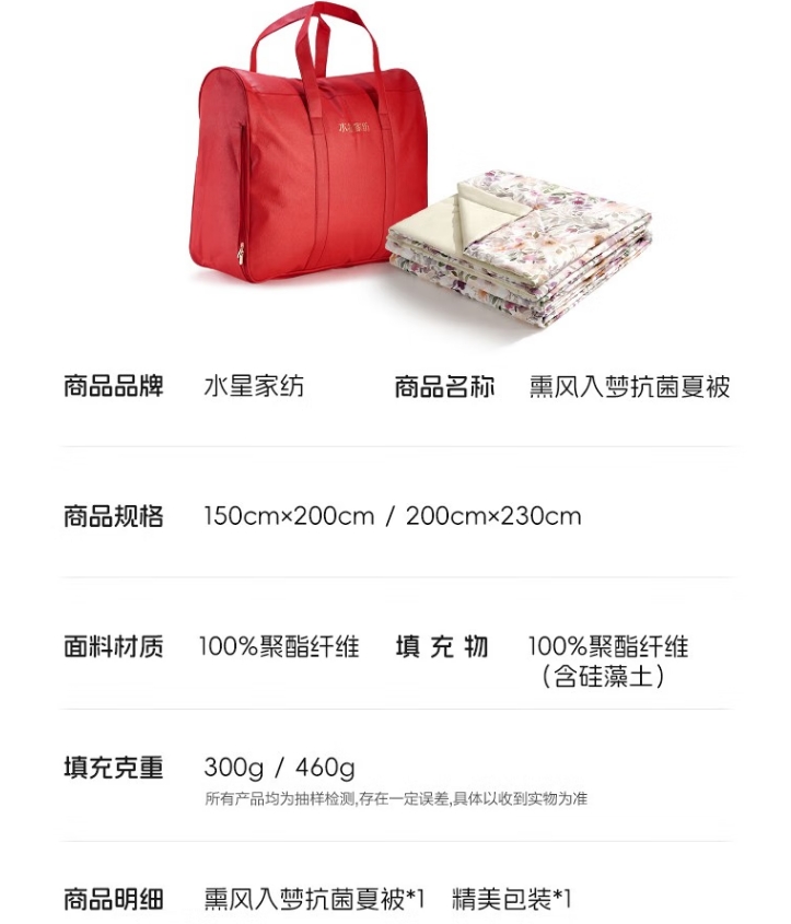 商品名称:水星家纺 熏风入梦抗菌夏被 200cm*230cm 127599