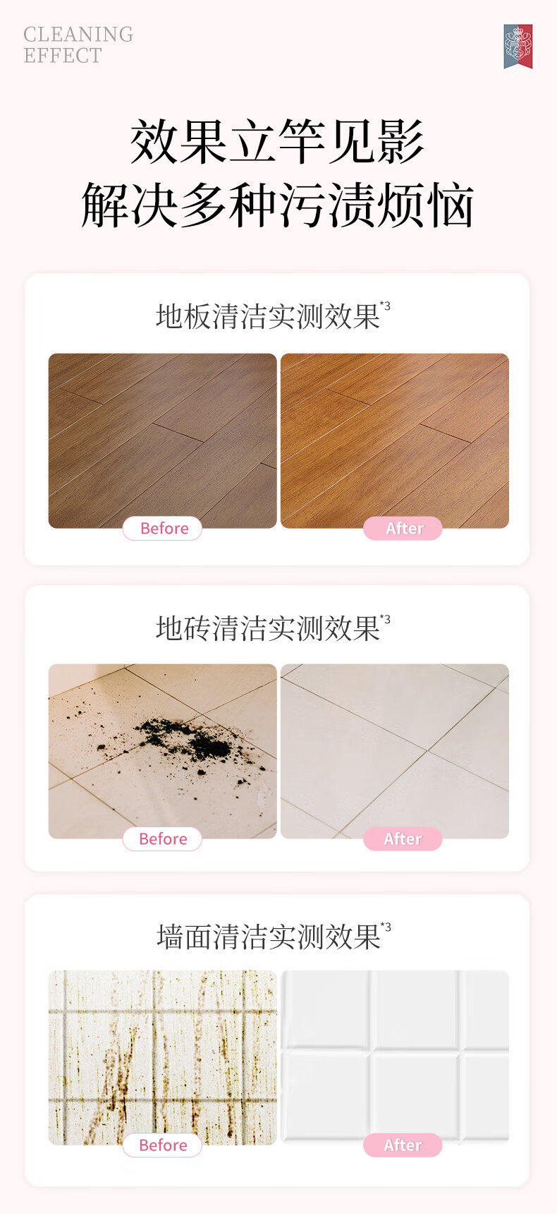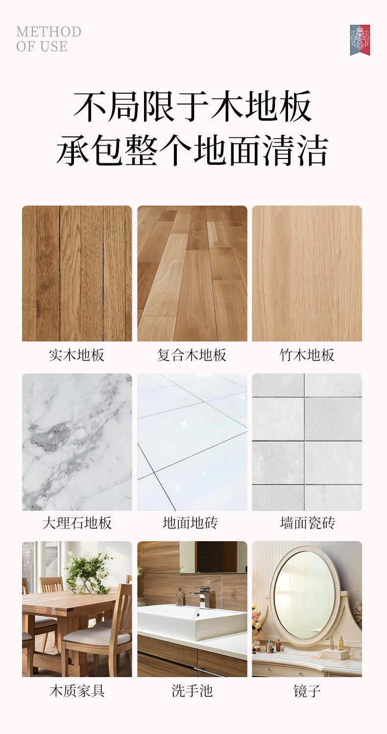 适用对象 :适用于瓷砖地砖、大理石、实木地板、复合地板、竹木地板、木质家具的表面清洁去污,扫地机也适用。
