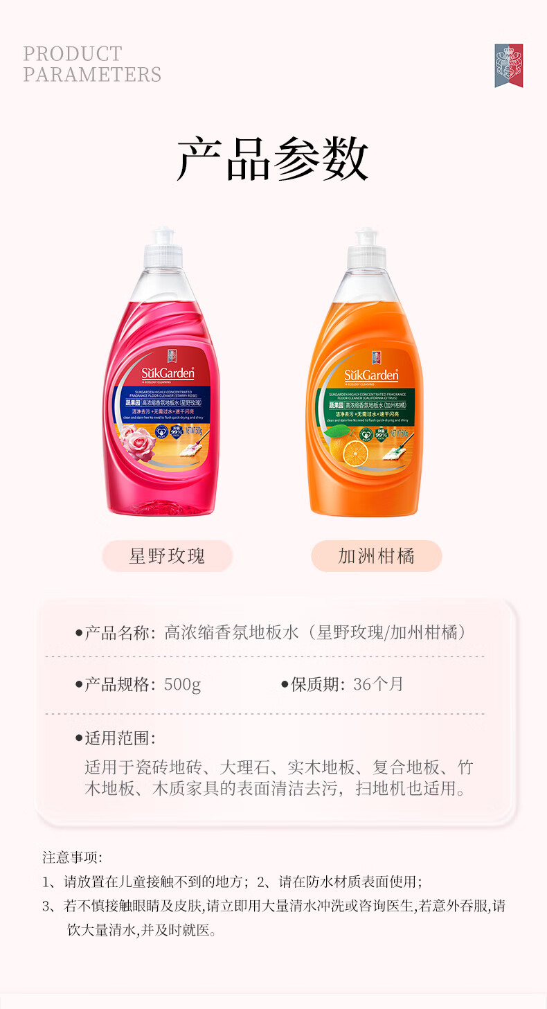 商品名称:蔬果园 SukGarden 高浓缩香氛地板水(加州柑橘)-500g SGY0523