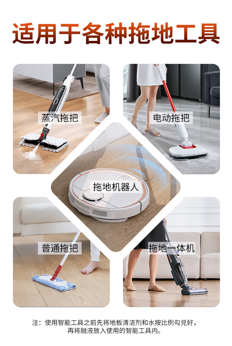 适用对象 :适用于瓷砖地砖、大理石、实木地板、复合地板、竹木地板、木质家具的表面清洁去污,扫地机也适用。