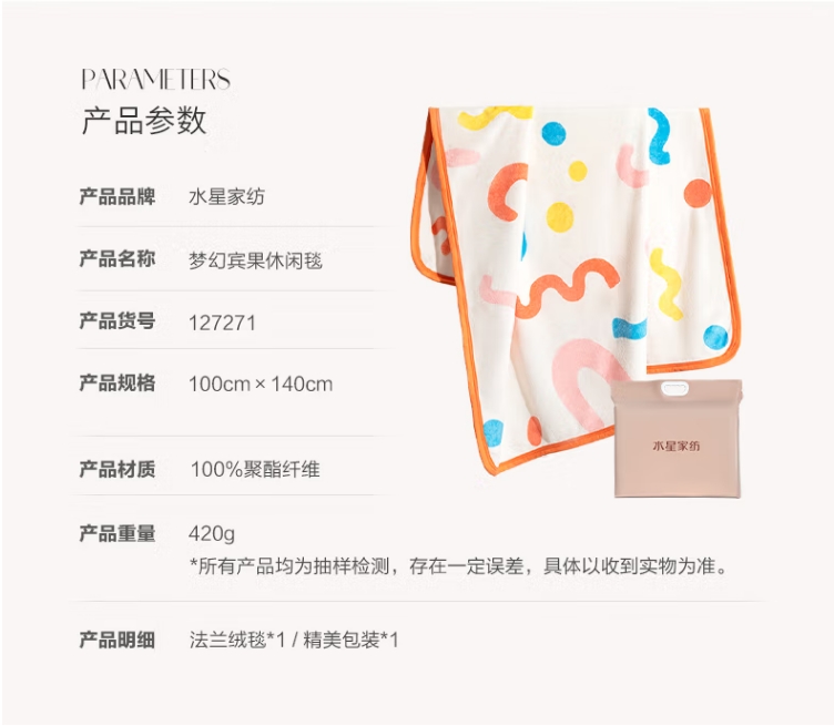 商品名称:水星家纺 梦幻宾果休闲毯 100*140cm 127271