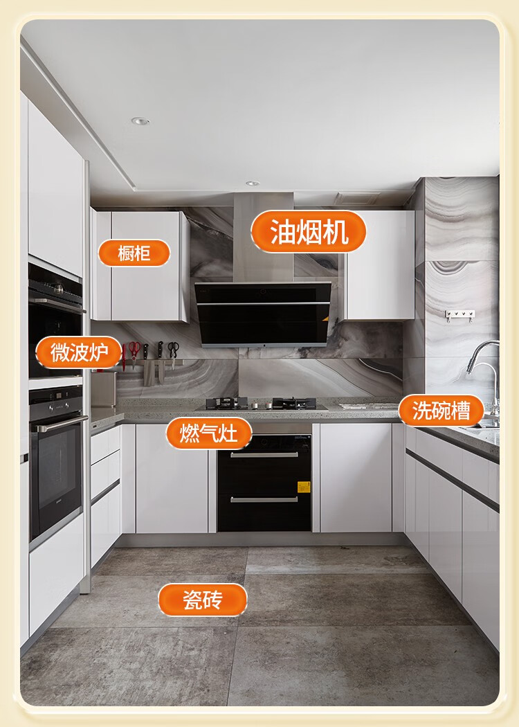 油烟机、微波炉、排气扇、冰箱、玻璃、瓷砖、餐桌、灶台等