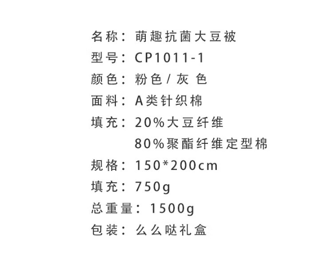 商品名称:洁丽雅 萌趣抗菌大豆被 1500g 150*200cm CP1011-1