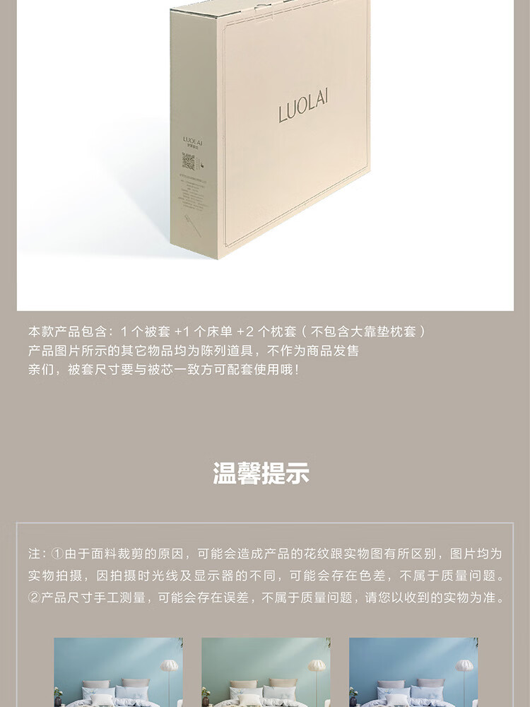 包装清单 :枕套:48*74cm*2 被套:200*230cm*1 床单:230*240cm*1