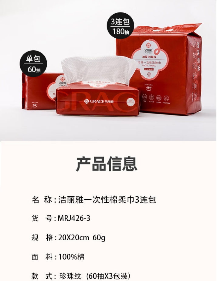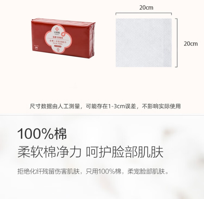 商品名称:洁丽雅 全棉一次性洗脸巾 20*20cm 60抽/*3包 MRJ426-3