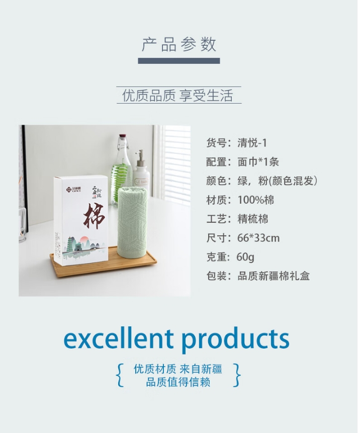 商品名称:洁丽雅 清悦-1 66*33cm 60g 面巾*1条