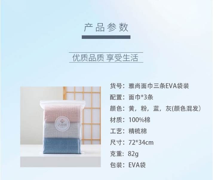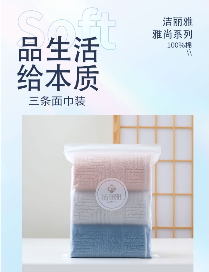 商品名称:洁丽雅 雅尚-3A 72*34cm 82g 纯棉面巾*3条(颜色混发)