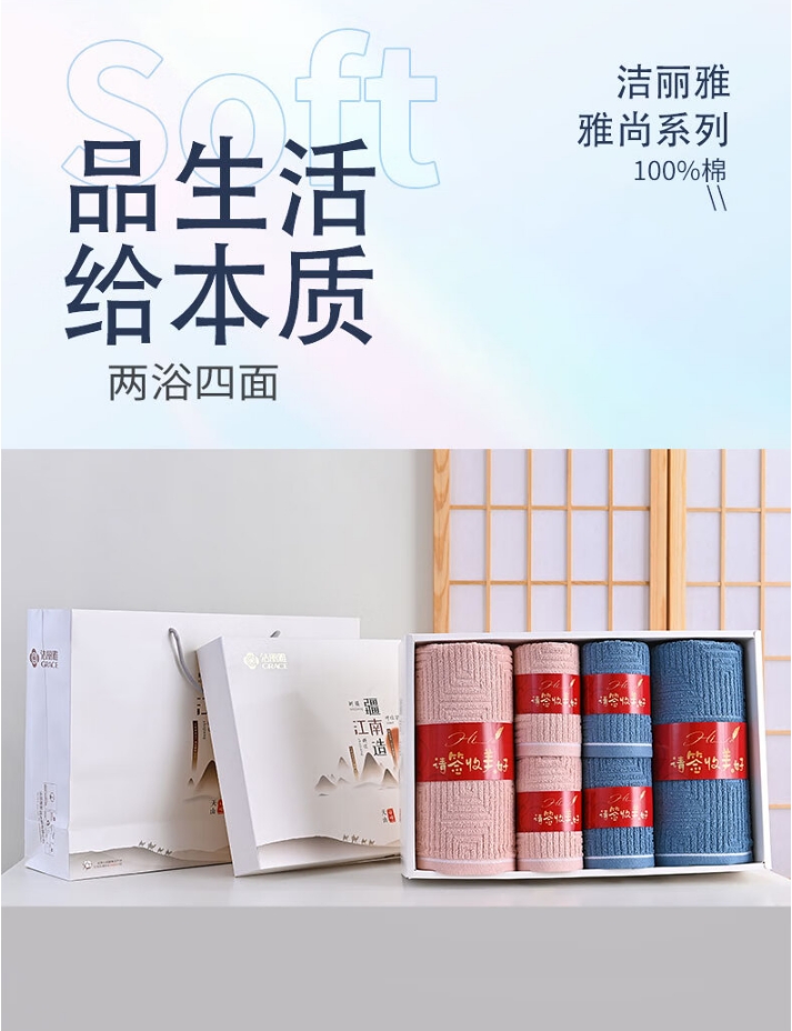 洁丽雅 雅尚-8 面巾*4条+浴巾*2条 面巾:72*34cm 82g / 浴巾:140*70cm 326g
