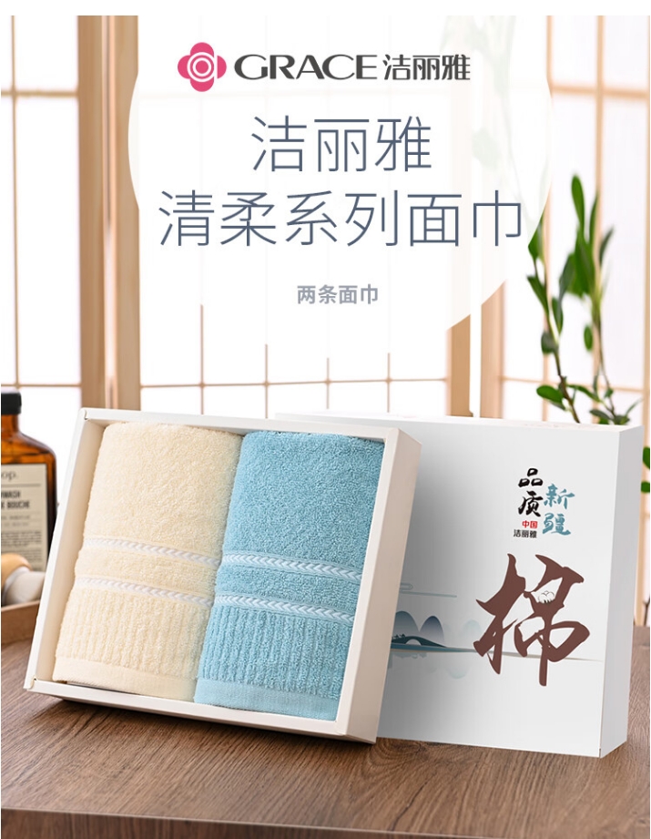 商品名称:洁丽雅 清柔-2 70*34cm 70g 纯棉面巾*2条 (颜色混发)