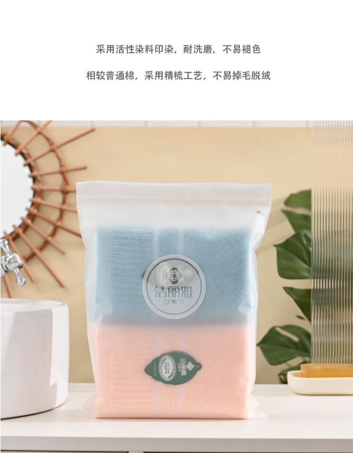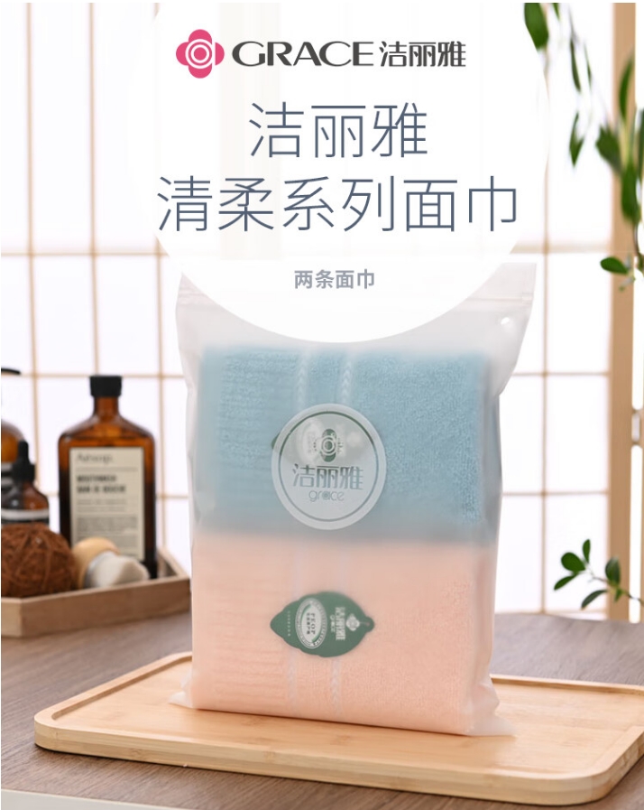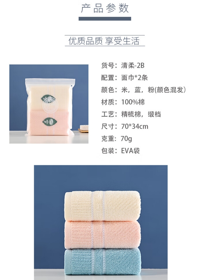 商品名称:洁丽雅 清柔-2B 70*34cm 70g 纯棉面巾*2条 (颜色混发)