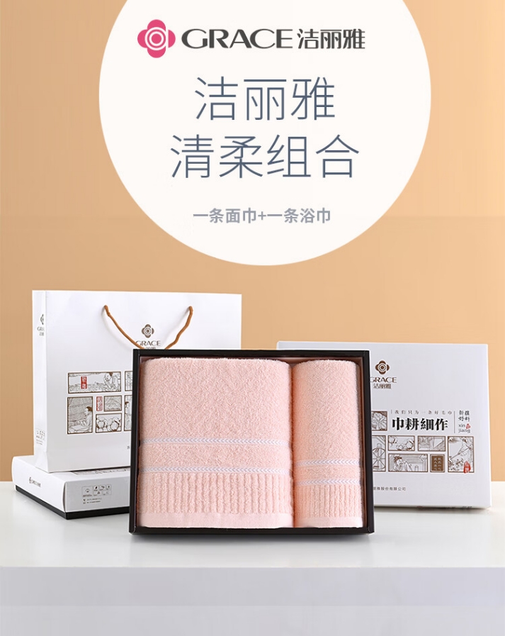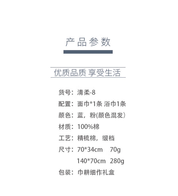 商品名称:洁丽雅 清柔-8 面巾*1条 +浴巾*1条 面巾:70*34cm 70g / 浴巾:140*70cm 280g