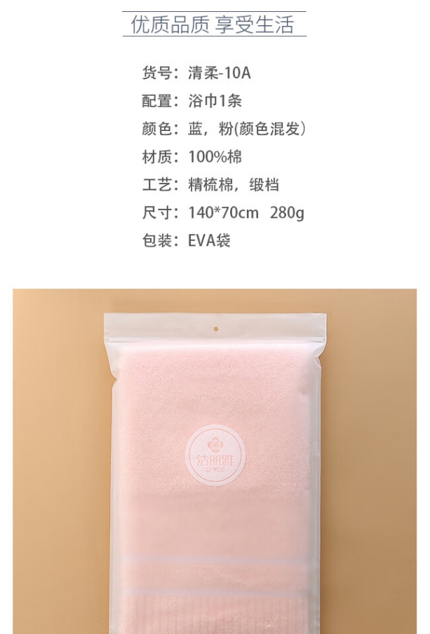 商品名称:洁丽雅 清柔-10A 140*70cm 280g 蓝/粉色纯棉浴巾*1条