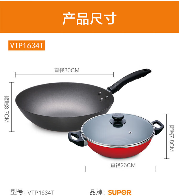 商品名称:苏泊尔 炒锅二件套汤锅套装 30cm炒锅+26cm煎锅 VTP1634T