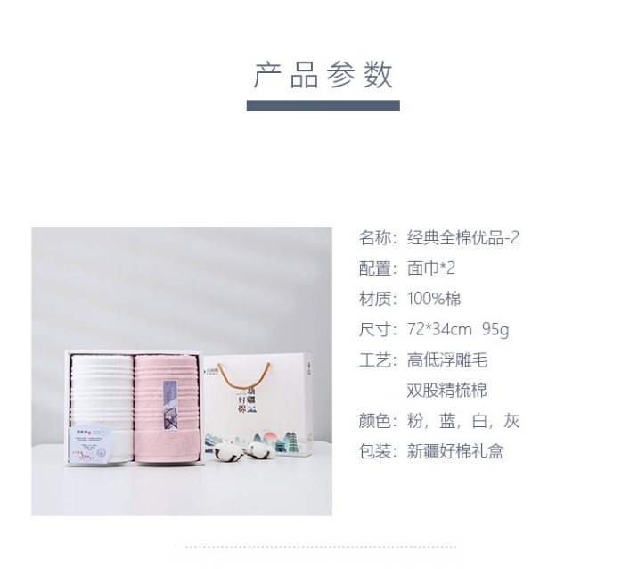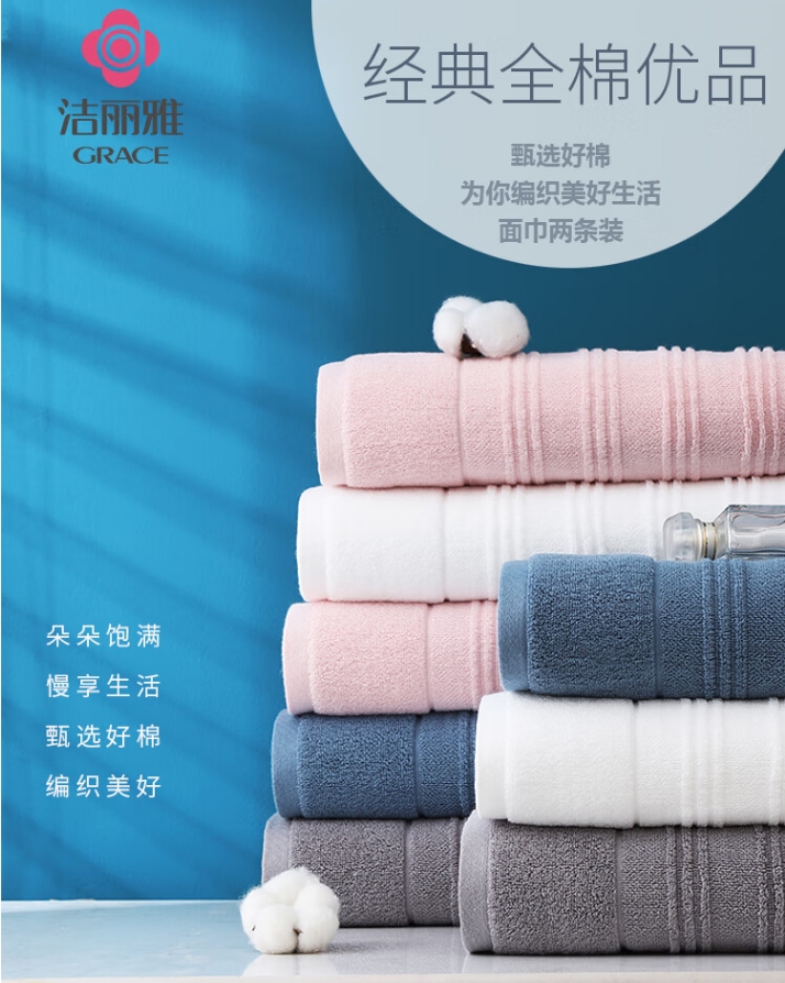 商品名称:洁丽雅 经典全棉优品-2 72*34cm 95g 面巾*2条 (颜色混发)